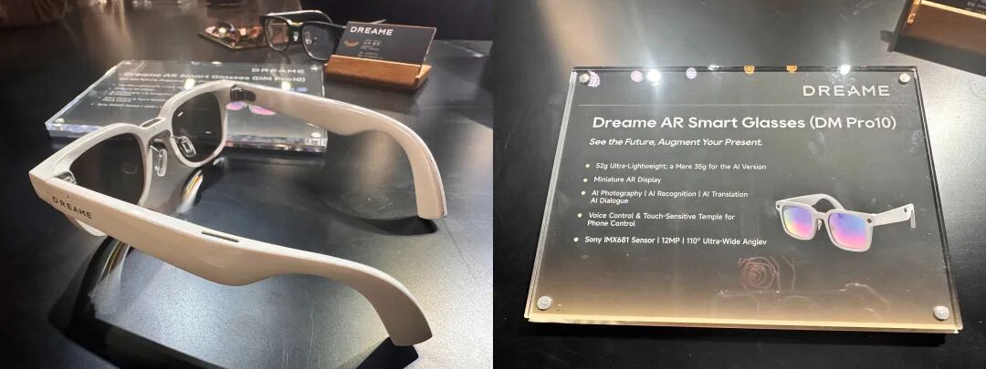追觅正在开发的智能眼镜现场也有展出,产品代号DM Pro 10(微光科技方案),本体为AI眼镜,重量35g,用户也可以通过磁吸的方式为眼镜增加一拖二衍射光波导模块,这时候重量将达到52g。