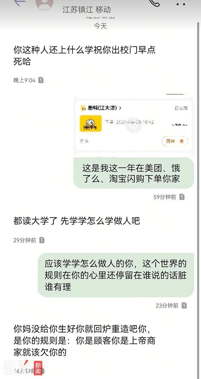 在帖文中,当事大学生还晒出了自己的订单截图,显示其购买了4串卤鸭板肠、猪手半只、贡菜1串、鸭翅1个,以及一个打包盒,上面备注“加热加热,要保温袋谢谢老板”。帖文中,还贴出了双方的短信对话截图,对方在短信中不仅辱骂“祝你出校门早点死”,还有“你妈没给你生好你就回炉重造”等言语。根据当事大学生的帖文,涉事店铺为墨鸭黑鸭王镇江江苏大学店。